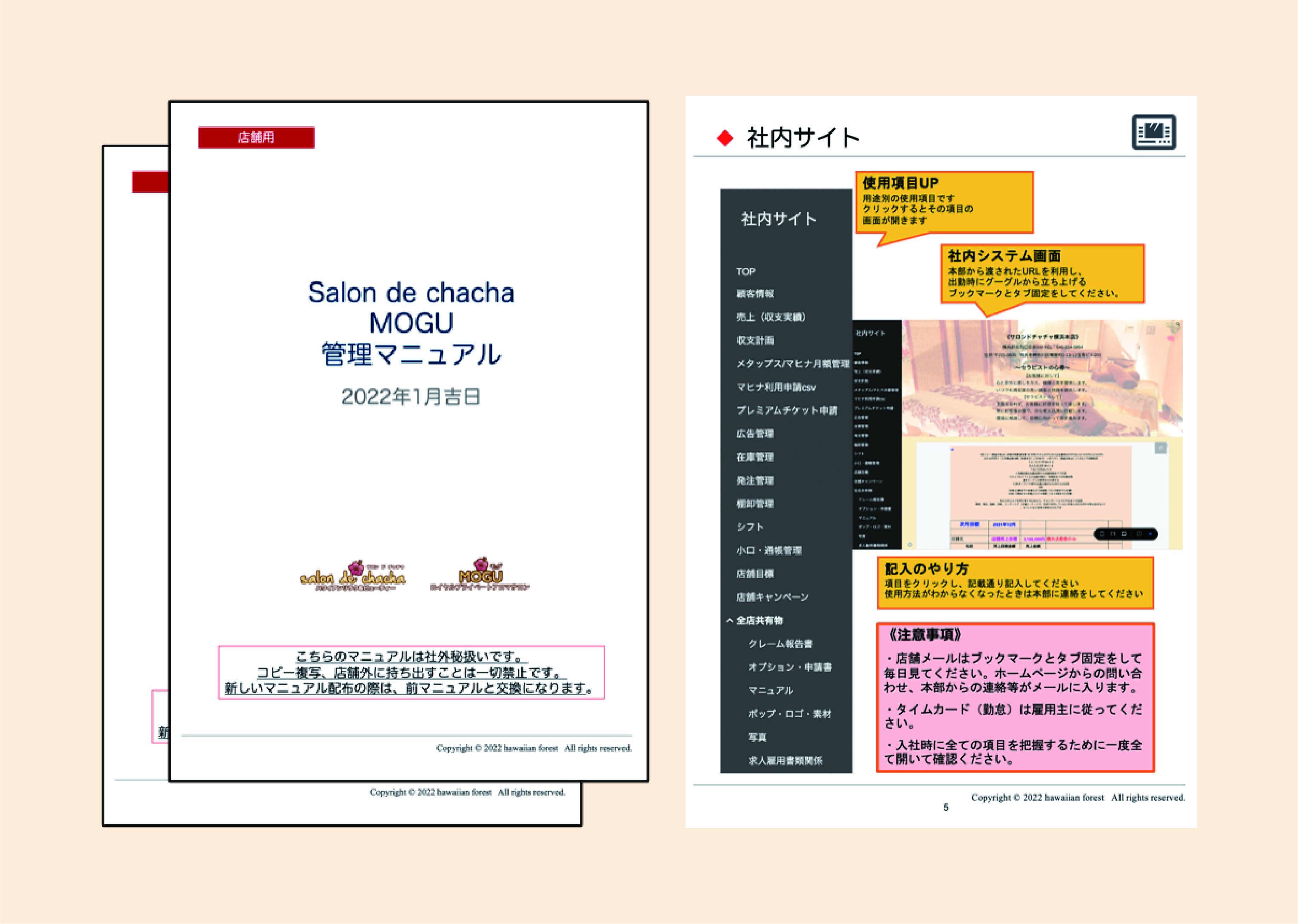 お客様単価1万円以上を保てるセラピストの本部研修。スタッフが管理業務を行えるように管理マニュアルも完備しています。 100ページ以上のサロンマニュアルを店内に完備しており、技術や接客動画の共有も徹底しています。